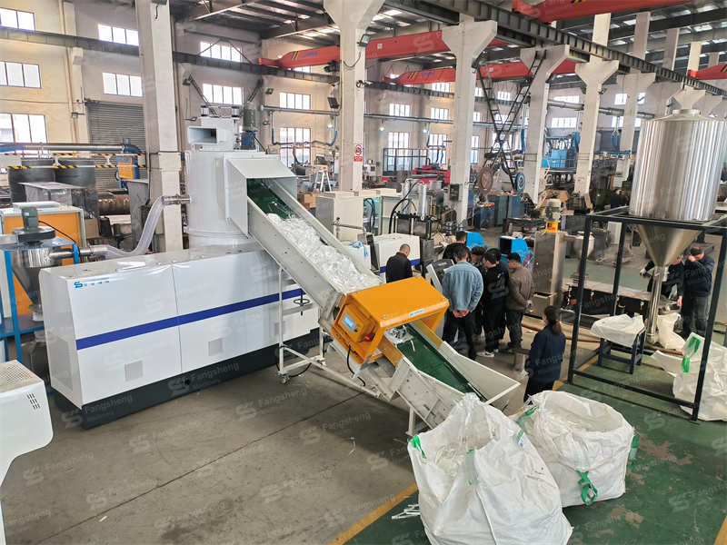 該塑料PP PE造粒生產線由方(fāng)聖機械公司專門設計,主要用於(yú)廢塑料薄膜(工業包(bāo)裝(zhuāng)薄膜、農用(yòng)薄(báo)膜、包裝袋等),編織袋,農(nóng)業方便袋,PP纖維,PP無紡布等。通(tōng)過帶式輸送機將PP PE薄膜輸送至壓實機。然後將材料(liào)切割,然後(hòu)強製進入(rù)擠出機(jī),切(qiē)粒,水槽,脫水機,最後吹進儲料鬥。根據您的要求,您可以選擇(zé)壓實機單階造(zào)粒機或雙階造粒機。 適用材料:工業包裝薄膜、農用薄膜、包(bāo)裝袋等),編織袋,農業方便袋,PP纖維(wéi),PP無(wú)紡布等(děng)。 特點:產量高(gāo),造粒能力好(hǎo)(100kg/h~1000kg/h).操
